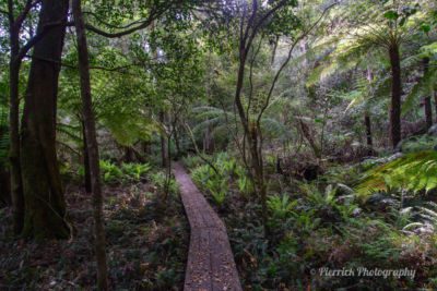 Après quelques mètres supplémentaires, la pente devient plus raide pour se terminer par un escalier en métal afin d’atteindre une plate-forme au sommet du mont Genoa. Du bas, on dirait une fusée transparente, attention prêts pour le décollage…un, deux, trois, partez ! On débarque alors sur une superbe vue à 360 degrés entre forêt, côte et océan qui vient récompenser une randonnée facile et agréable.